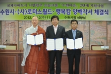사단법인 로터스월드가 캄보디아 시엠립 쁘놈크롬마을 취약계층 주민의 빈곤퇴치와 삶의 질 개선을 위해 수원시와 양해각서를 체결했다. 로터스월드 이사장 성관 스님과 염태영 수원시장, 국제자원봉사단체 행복캄 홍순목 회장은 9월 12일 오전 11시 30분 수원시청에서 2013년 1월부터 2015년 12월까지 3년 간 7억 원의 사업규모를 가진 ‘시엠립 쁘놈크롬마을 ...