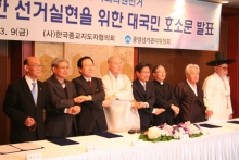 한국종교지도자협의회(대표의장 자승 스님)는 3월 9일 오전 11시 롯데호텔에서 제19대 국회의원선거와 관련해 중앙선거관리위원회(위원장 김능환)와 간담회를 갖고 '바르고 깨끗한 선거 실현을 위한 대국민 호소문'을 발표했다. 이날 한국종교지도자협의회 공동대표의장 자승 스님은 호소문을 통해 △민주정치 발전과 국민화합을 위해 바르고 깨끗한 선거실현에 우리 모두 동...