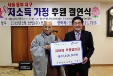 국제개발구호NGO (사)지구총공생회(이사장 월주 스님)가 국내 저소득 가정에 자비의 손길을 내밀었다. 지구촌공생회와 조계종 영화사는 2월 22일 오후 1시 영화사 설법전에서 ‘저소득 가정 결연 및 후원금 전달식’을 갖고 서울 광진구지역 내 저소득층 가구에 후원금을 전달했다. 지구촌공생회는 2010년부터 광진구 저소득층 100여 가구에 연 3천만 원의 후원금...