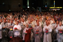 1만여 불자들과 시민들이 4대강 개발중단과 문수 스님 추모를 위해 서울광장에 모여 촛불을 들었다. 조계종과 문수스님소신공양추모위원회는 7월 17일 오후 7시 30분 서울광장에서 ‘문수 스님 소신공양 국민추모문화제’를 봉행했다. 조계종 재정국장 각운 스님의 ‘서원의 북소리'로 문을 연 문화제는 문수 스님의 소신공양을 기리는 묵념에 이어 천도의식과 회심곡이 ...
