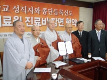 조계종과 동국대학교가 이웃종단은 물론 신부, 수녀, 목사 등 이웃종교인들에게 의료비 감면혜택을 제공하는 의료비 감면 협약식을 체결했다.3월 9일 오후 2시 한국불교역사문화기념관 4층 회의실에서 열린 협약식에는 조계종 총무원장 자승 스님과 포교원장 혜총 스님, 동국대 이사장 정련 스님, 동국대 상임이사 성관 스님, 동국대 오영교 총장, 동국대 민응기 의료원장...