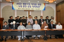 불교와 개신교, 천주교, 원불교 등 4대 종단 종교인들이 정부의 4대강 개발사업 포기를 촉구하고 나섰다. 4대 종단의 환경단체들이 참여하는 종교환경회의는 10월 16일 오전 11시 서울 연지동 기독교회관강당에서 4대강 개발사업 저지를 위한 4대 종단 공동 기자회견을 개최했다.이들은 기자회견문을 통해 "국민의 74%가 반대하는 4대강 사업에 25조원의 국민...