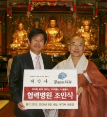 궁플란트치과(원장 최우환)는 9월 19일 조계종 대각사(주지 장산 스님)와 무의탁 독거어르신 무료 틀니지원협력병원 조인식을 가졌다. 대각사에서 매월 1명의 무의탁 독거어르신을 선정, 궁플란트치과로 추천해 무료로 틀니시술을 할 예정이다. 최 원장은 “앞으로도 어려운 이웃을 위해 더욱 많은 무료 치과진료 의료봉사를 하겠다”며 “부처님의 말씀을 실천하고 포교...
