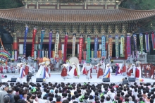 천태종(총무원장 정산 스님)은 9월 15일 오후 4시 총본산 구인사(충북 단양군 영춘면 백자리) 대조사전 앞 특설무대에서 영산재의 뒤풀이마당인 삼회향놀이를 시연했다. 이날 삼회향놀이는 길놀음에 이어 사물(범종, 법고, 운판, 목어) 공연을 시작으로 천태종 감사원장 춘광 스님 등 30여 명의 법고춤으로 흥을 돋운 뒤 법주와 바라지, 땅재주와 줄타기, 나비춤과...