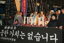 새해벽두 1월 20일 새벽에 벌어진 '용산참사'의 영혼을 달래기 위한 추모 시국법회가 열렸다.불교환경연대, 실천불교전국승가회, 불교인권위원회 등 불교계 20여개 단체로 구성된 시국법회추진위원회(공동추진위원장 수경 스님 등)는 2월 5일 오후 6시 30분 조계사 앞마당에서 '용산참사 희생자를 위한 시국법회'를 봉행하고 고인들의 극랑왕생을 기원했다. 사부대중...
