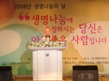(사)생명나눔실천본부(이사장 일면 스님)는 11월 20일 서울 종로구 부암동 W컨벤션센터에서 '2008 생명나눔의 날' 행사를 개최했다.이날 1부 행사에서는 장기이식으로 생명나눔을 실천한 기증자와 후원자, 후원단체에 대한 표창과 환자지원금 전달식 등이 진행됐다. 또 2부에서는 'BBS 김병조의 이야기쇼' 공개방송이 열려 강진, 박현빈, 유지나, 이고은, 추...