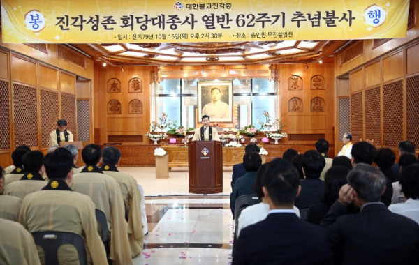 진각종(통리원장 능원 정사)은 10월 16일 오후 2시 30분 서울 진각문화전승원 1층 무진설법전에서 ‘진각성존 회당대종사 열반 62주기 추념불사’를 봉행하고 종조님 열반의 의미를 되새겼다.추념불사에는 덕일 총인예하를 비롯해 기로스승 경정, 수성 정사, 통리원장 능원 정사, 종의회의장 증혜 정사, 교육원장 정법 정사, 진각복지재단 대표이사 현강 정사, 위덕대 총장 보성 정사, 총금강회장 정명 각자 등 서울교구 스승과 유가족, 신교도, 학교법인 회당학원, 진각복지재단 산하기관 관계자들이 참석했다.이날 통리원장 능원 정사는 추념사를 통...